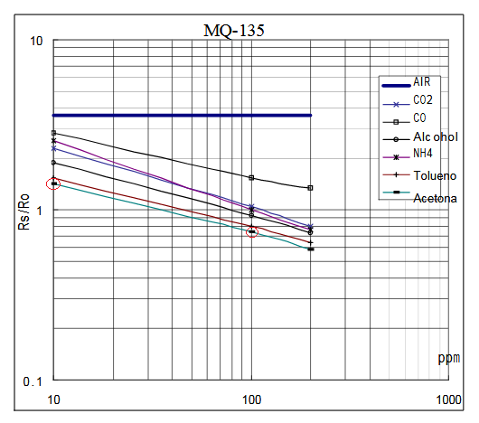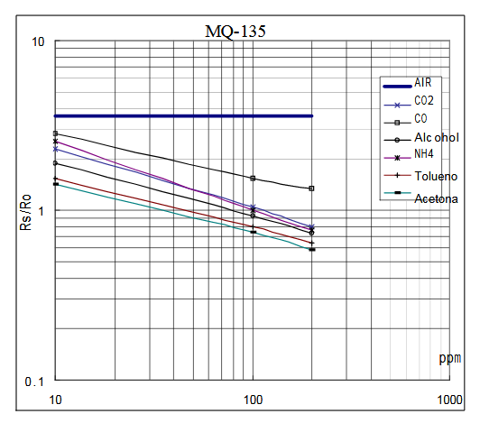 Like all MQ gas sensors, the MQ-135 follows a sensitivity curve: