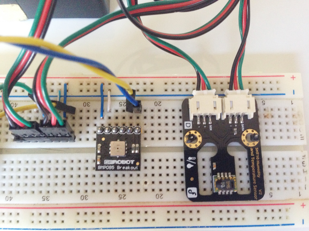 For temperature and humidity, I used SHT1x from DFRobot. For the atmospheric sensor, I used the old reliable BMP085. My Arduino BMP085 tutorial covers how to use this sensor with the Arduino. The NodeMCU uses the same Arduino IDE and code as long as the ESP8266 core is installed.