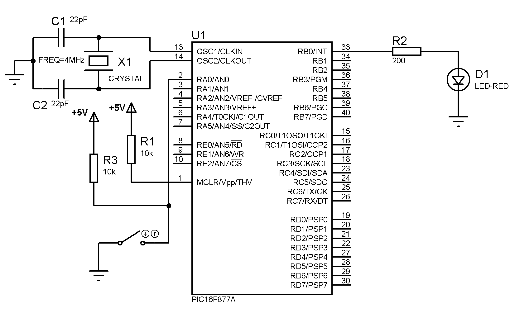 Home / PIC16F877A - More Microcontroller Features / pic16f877a_switch_led_circuit
