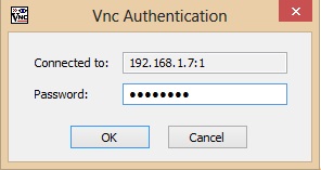 Enter your Raspberry Pi's IP address and the VNC display number (or port). My RPi is at 192.168.1.7 and my VNC display number is 1 (as seen from the terminal when I ran vncserver). Click "Connect" and you'll then be asked for the password I mentioned earlier: